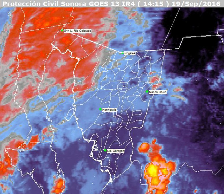 Unidad Estatal de Protección Civil informa en sus diferentes medios, q hay nublados con potencial de lluvias principalmente en el Noroeste de Sonora.Imagen Protección Civil Son