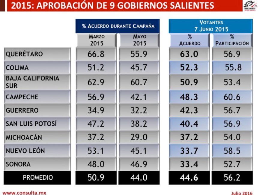 CONSULTA MITOFSKY...Elecciones de Gobernador 2015, Mandatarios que salieron: El mejor evaluado fue de Querétaro y peor de SONORA