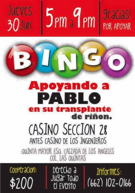 ASISTE A UN DIVERTIDO BINGO Y A LA VEZ COOPERA EN ESTA NOBLE LABOR DE APOYAR A PABLO, LO RECAUDADO SERÁ PARA REUNIR FONDOS PARA LA CIRUGÍA DE TRANSPLANTE DE RIÑON.