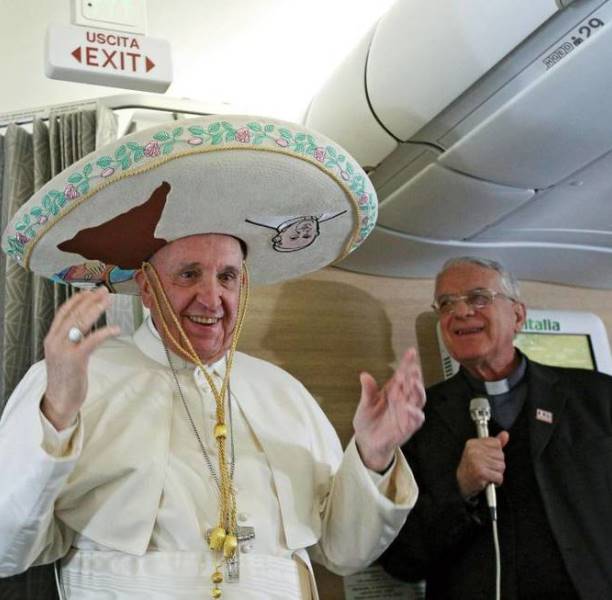 Antes de comenzar a saludar uno por uno a los periodistas, Bergoglio recibió un sombrero de Charro mexicano con una imagen de Nuestra Señora de Guadalupe y se lo colocó emocionado/Notimex
