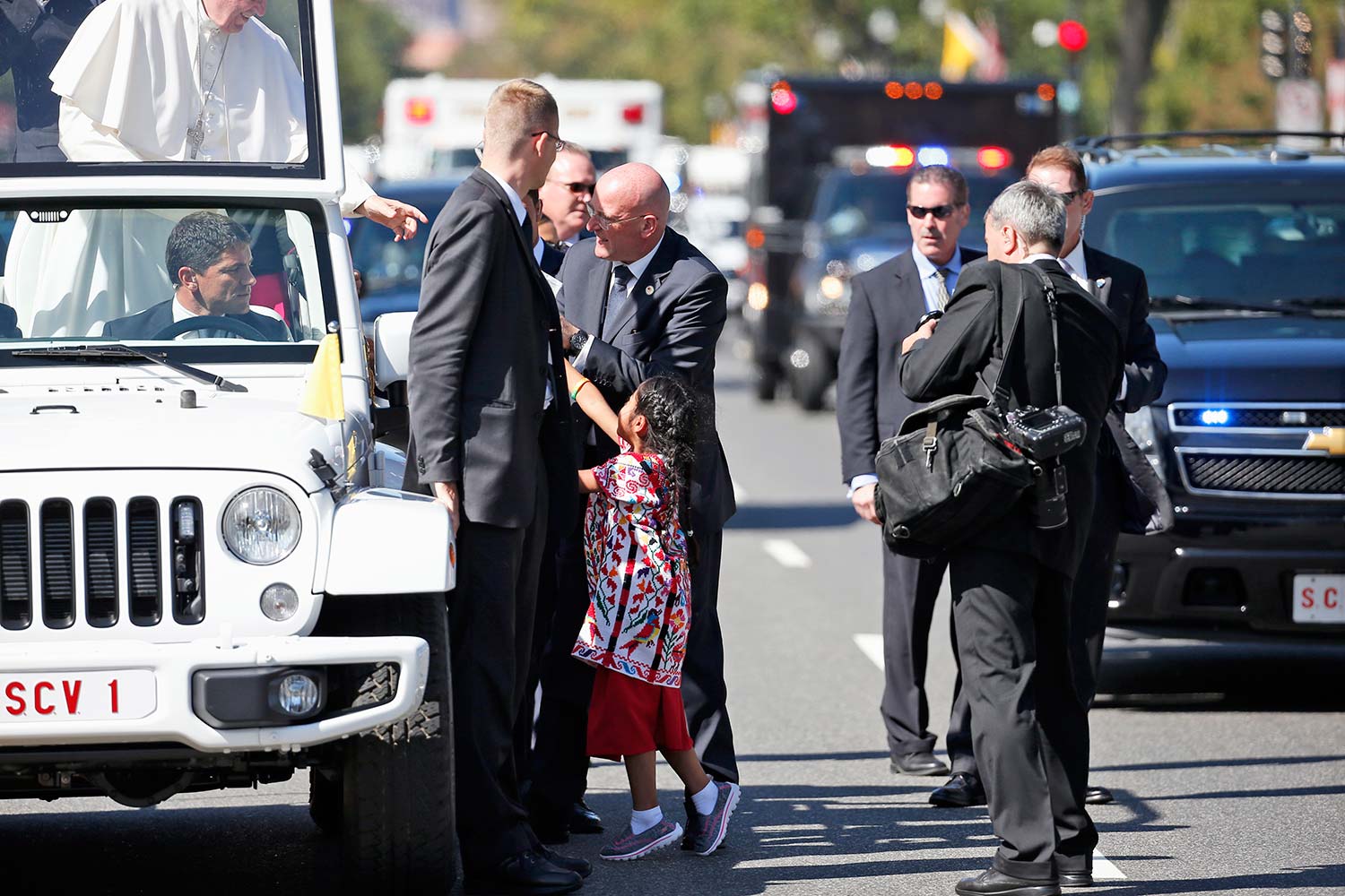 La menor se acercó a la comitiva del pontífice, el cual la besó y abrazó luego de que esta le regalara una carta y una playera/ Notimex / Foto: AP