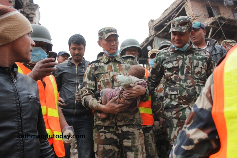 Rescatan con vida a bebé de 4 meses entre escombros en Nepal…El pequeño fue socorrido por militares que escucharon su llanto entre los escombros en la ciudad de Bhaktapur, 22 horas después del desastre/http://kathmandutoday.com
