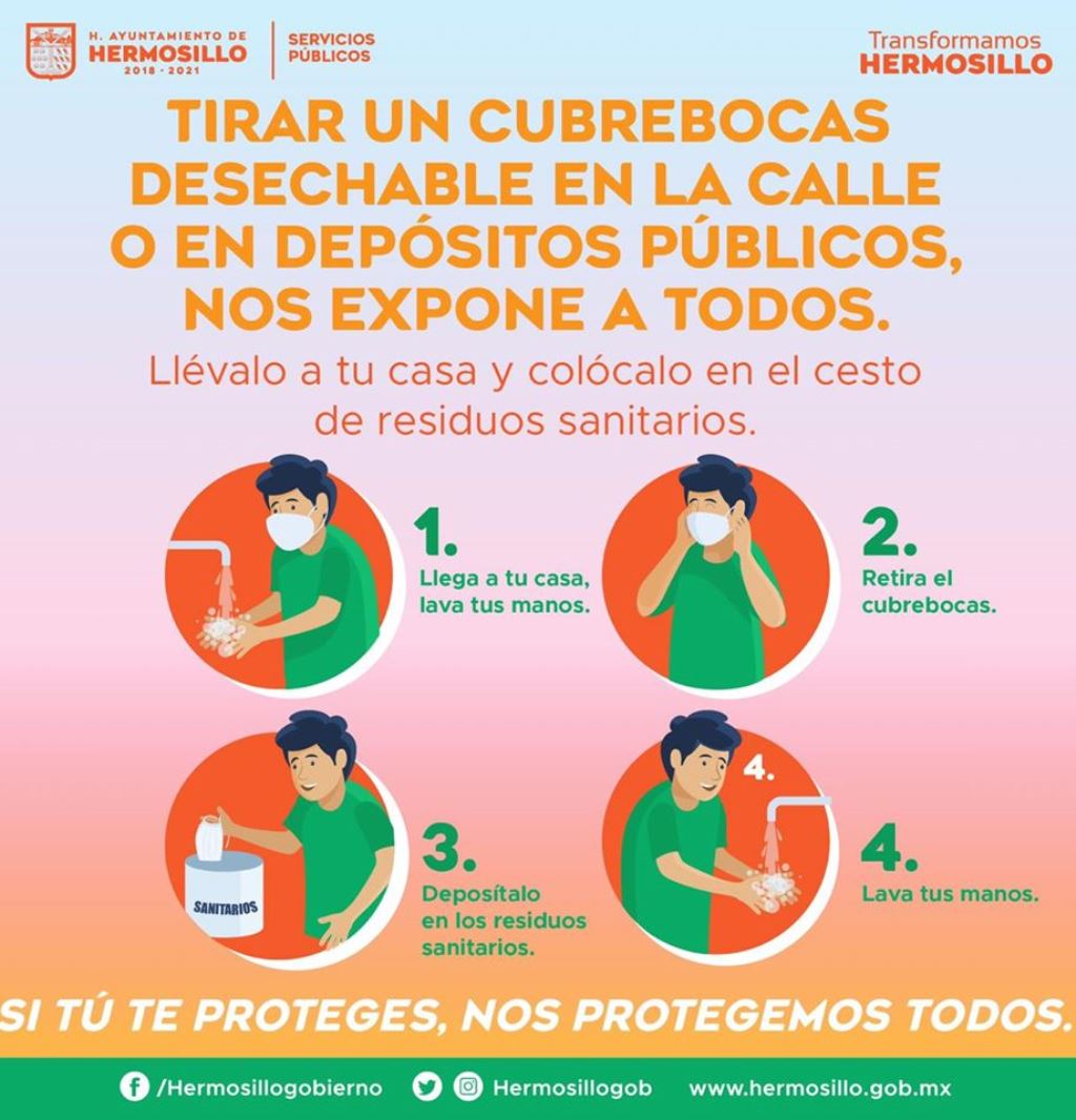 Al utilizar un cubre bocas, es importante que también tomes las medidas adecuadas una vez que termines de usarlo. Si tú te proteges nos protegemos todos/Gobierno de Hermosillo