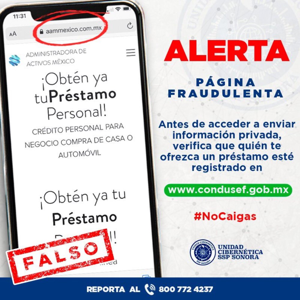 "aammexico .com.mx" es una página web fraudulenta que estafa a usuarios que desean acceder a créditos solicitándoles información personal y depósitos bancarios/ Unidad Cibernética SSP Sonora