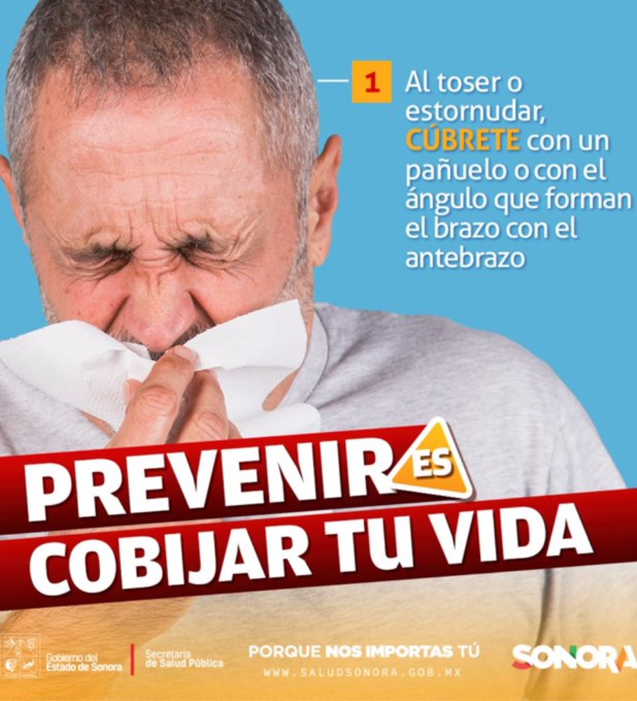 Evita contagios, al estornudar cúbrete con un pañuelo o con la parte interior del codo. #PrevenciónEsSalud #SaludSonora