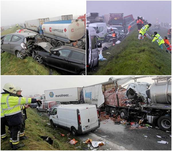 Decenas de camiones y automóviles chocaron a causa de la densa niebla que cubría la autopista A19 en Zonnebeke, Bélgica. Al lugar llegaron equipos de emergencia para rescatar a las personas que se encontraban atrapadas en los autos