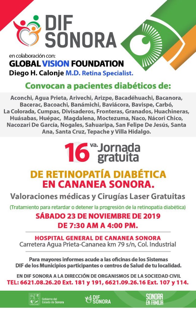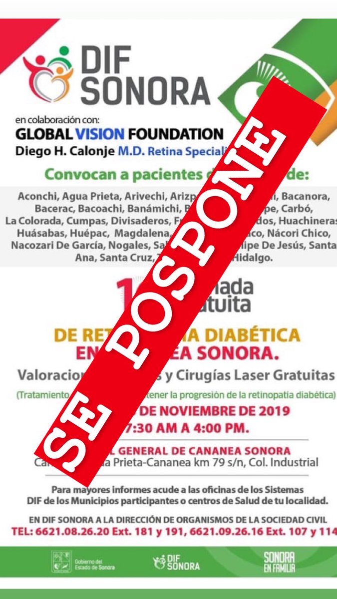 Debido a los efectos del frente frío no. 16, la jornada gratuita de Retinopatía Diabética programada para este sábado 23 de noviembre en Cananea se pospone hasta nuevo aviso.