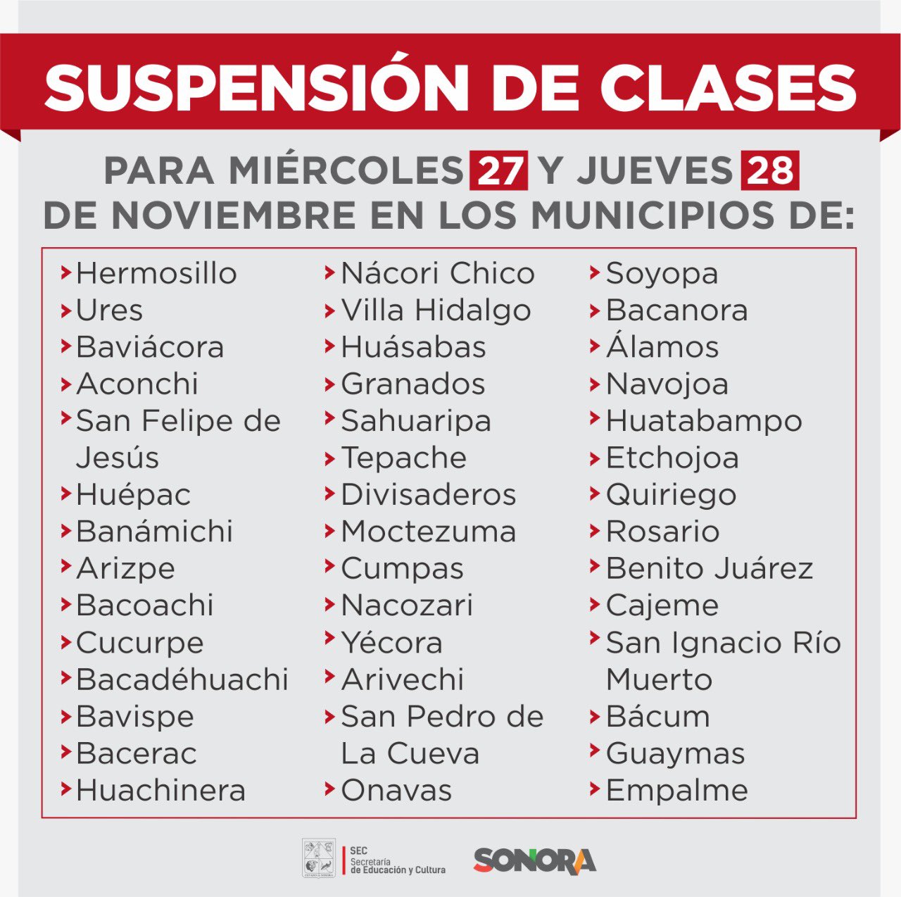 Se determina la suspensión de clases en educación Básica para 42 municipios del centro y sur del estado, los días miércoles 27 y jueves 28 de noviembre/SEC Sonora