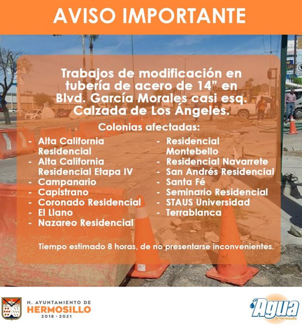 #AguaHInforma Colonias que se verán afectadas en el servicio de agua por los trabajos de modificación de tubería de 14" a realizarse el próximo martes 20 de agosto en Blvd. García Morales casi esquina con Calzada de los Ángeles