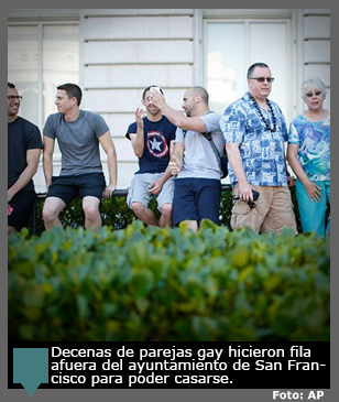 Decenas de parejas gay hicieron fila el sábado afuera del ayuntamiento de San Francisco mientras los funcionarios reanudaban la emisión de licencias matrimoniales entre homosexuales un día después de que un tribunal federal de apelaciones despejó el camino para que el estado de California derogara de inmediato una suspensión de cuatro años.