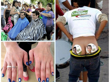 Unos se pintan las uñas, otros se ponen calcas en las pompis, cualquier cosa es buena para mostrar que uno u otro aspirante a la alcaldía es su "gallo".