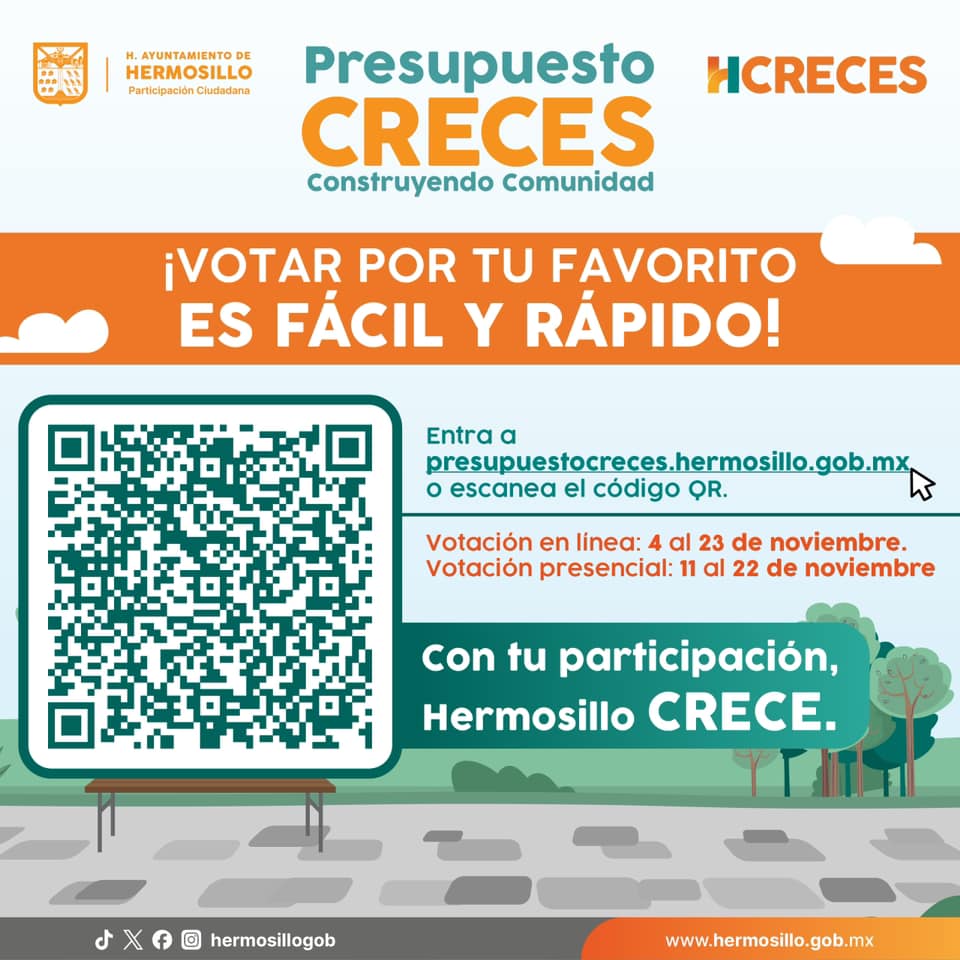Conoce las propuestas y elige la que más te guste votando en línea en presupuestocreces.hermosillo.gob.mx o al WhatsApp 6621550100