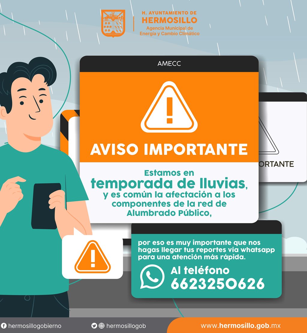 Inició la temporada de lluvias, y es común la afectación a los componentes de la red de Alumbrado Público por eso ponemos a su disposición nuestro whatsapp, para una atención más rápida/Gobierno de Hermosillo