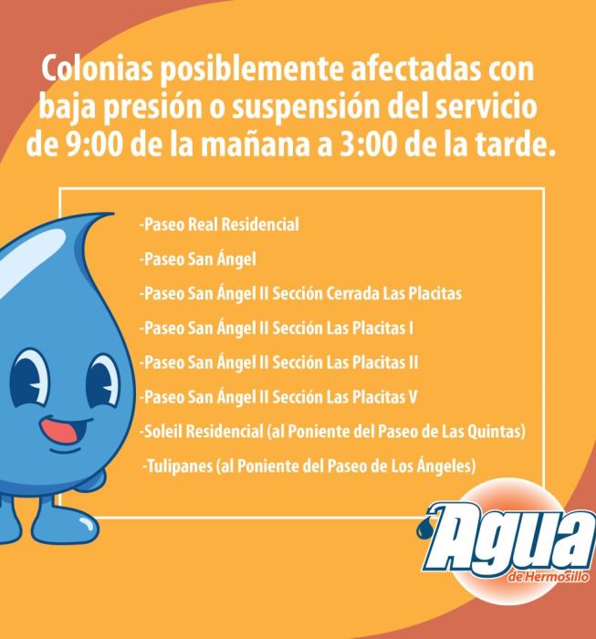 Por interconexión de tubería, 8 colonias del sector San Ángel podrían tener baja presión o falta de agua este sábado 04 de febrero/Agua de Hermosillo