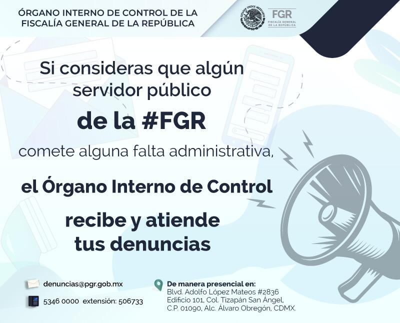 En caso de que alguna servidora o servidor público de la #FGR cometa una falta administrativa, puedes presentar una denuncia en el Órgano Interno de Control #OIC. Llama al 55 5346 0000 extensión 506733 o escribe al correo denuncias@pgr.gob.mx